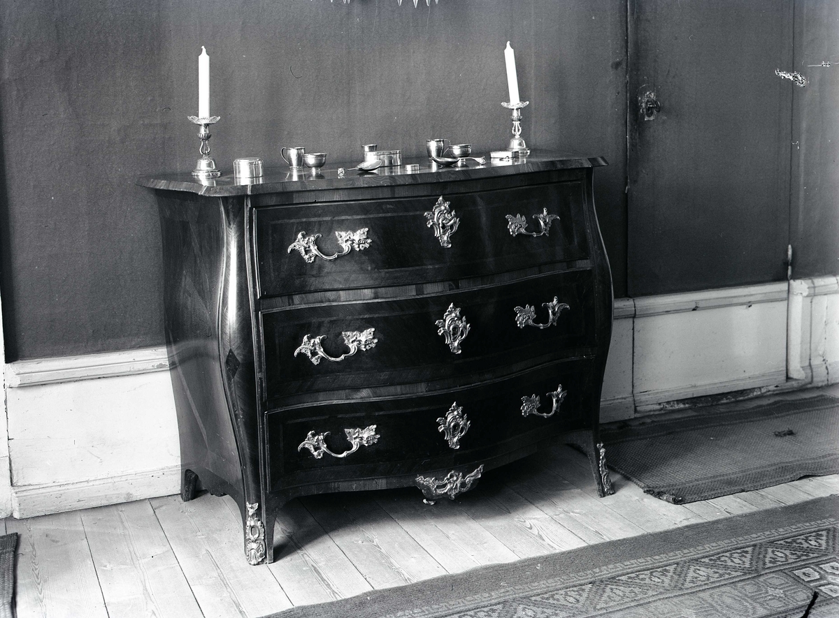 Nordstjärnans hus i kvarter Borgmästaren 4. Bottenvåning: Fru Linds våning. En byrå med ljusstakar och silverföremål.