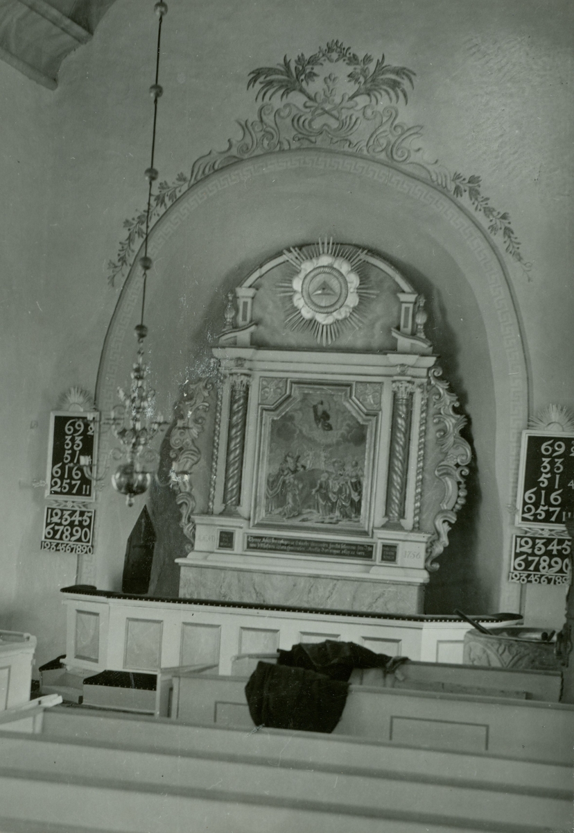 Altare, strålsol, psalmtavla och kyrkbänkar i Egby kyrka.