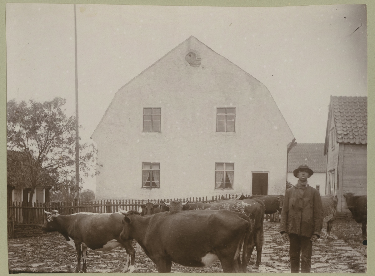 Man med nötkreatur på ladugårdsbacke i Halltorp på Öland.