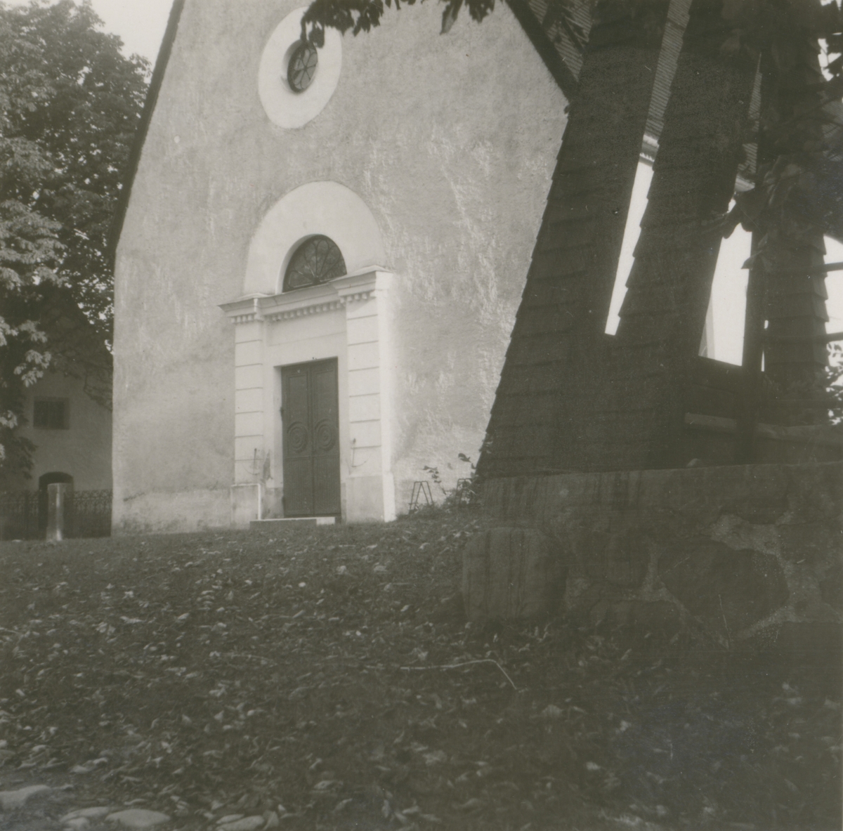 Bild på benen av en klockstapel och Mortorps kyrka.