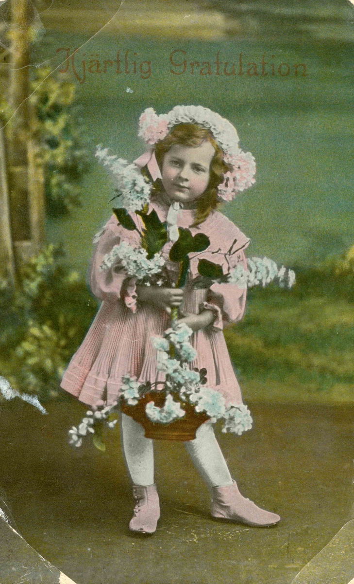Ett gratulationskort på Maria-dagen till Karin Andersson, Vegagatan 6, Kalmar från Signe, moster Nanny och Elsa.