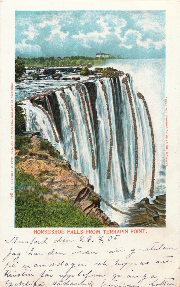 Vykort till Kristina Andersson, född 1865 i Böda, syster till N J Andersson, när hon bodde i USA från vänner i USA. Motivet på framsidan föreställer Horseshoe falls from Terrapin point.
