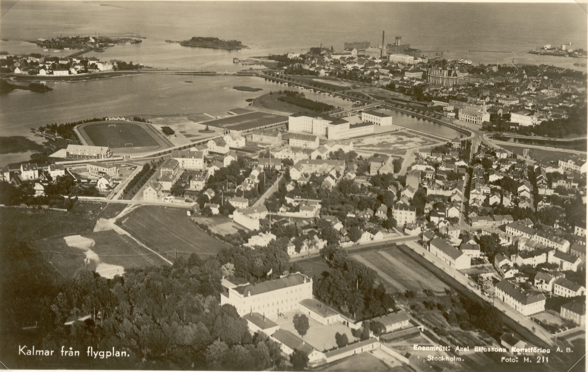 Flygfoto över Kalmar. Centrum med idrottsanläggning, skola, domkyrka och stadsbebyggelse.