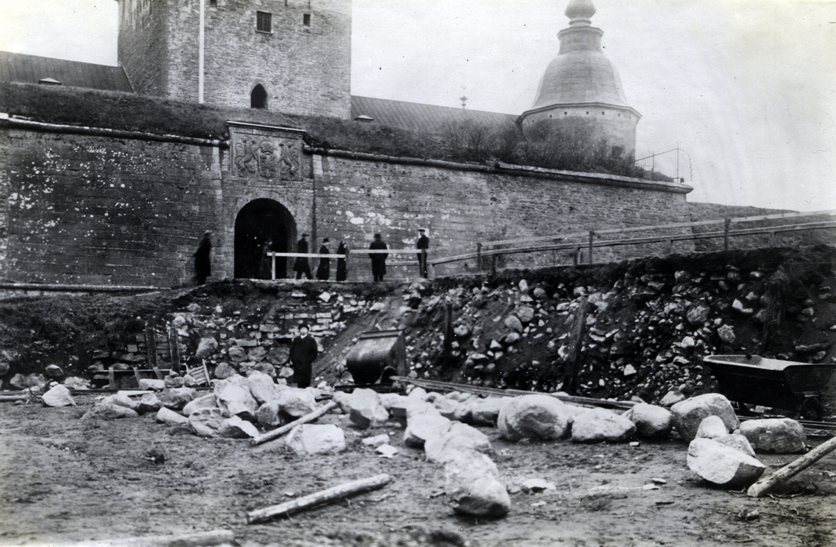 Utgrävning 1932 av vallgraven på västra sidan av Kalmar slott.