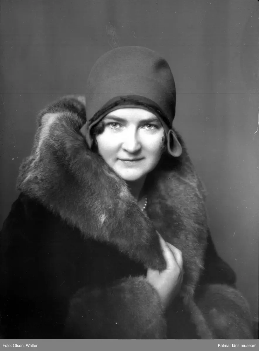 Ateljébild på en kvinna i kappa och hatt. Enligt Walter Olsons journal är bilden beställd av fröken Christoffersson ifrån Ängelholm.
