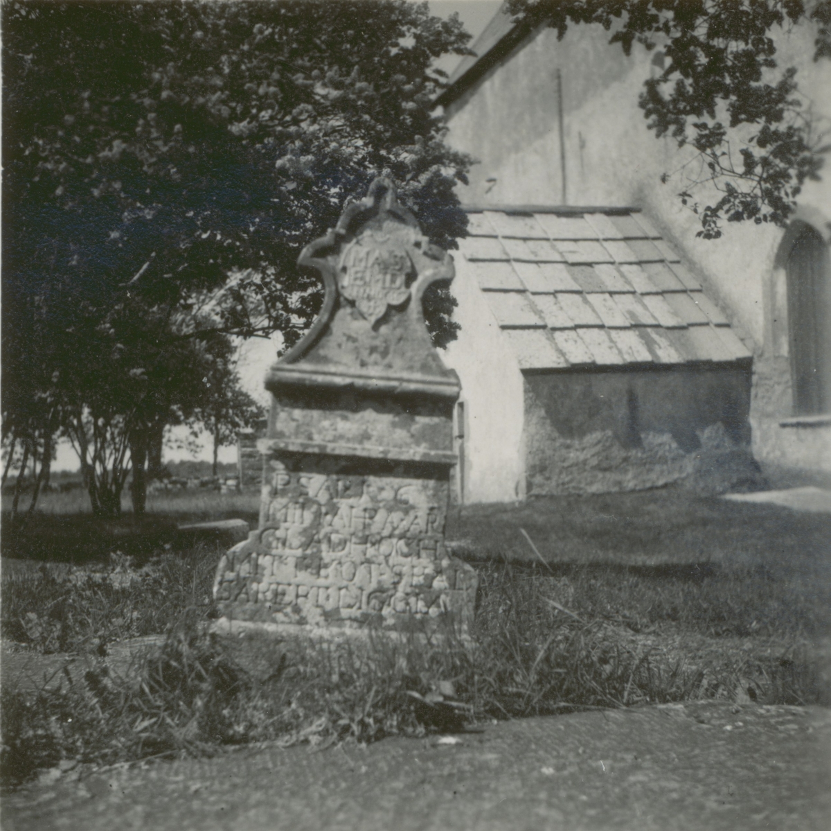 Källa ödekyrka med sakristian i bakgrunden och en gravsten i förgrunden.