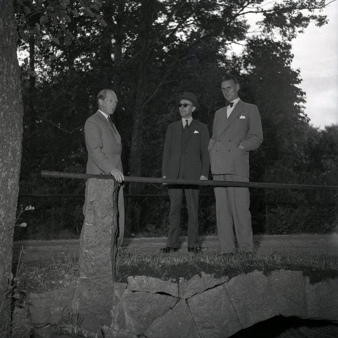Statsrådet Eliasson till vänste, håller i räcket till en bro.