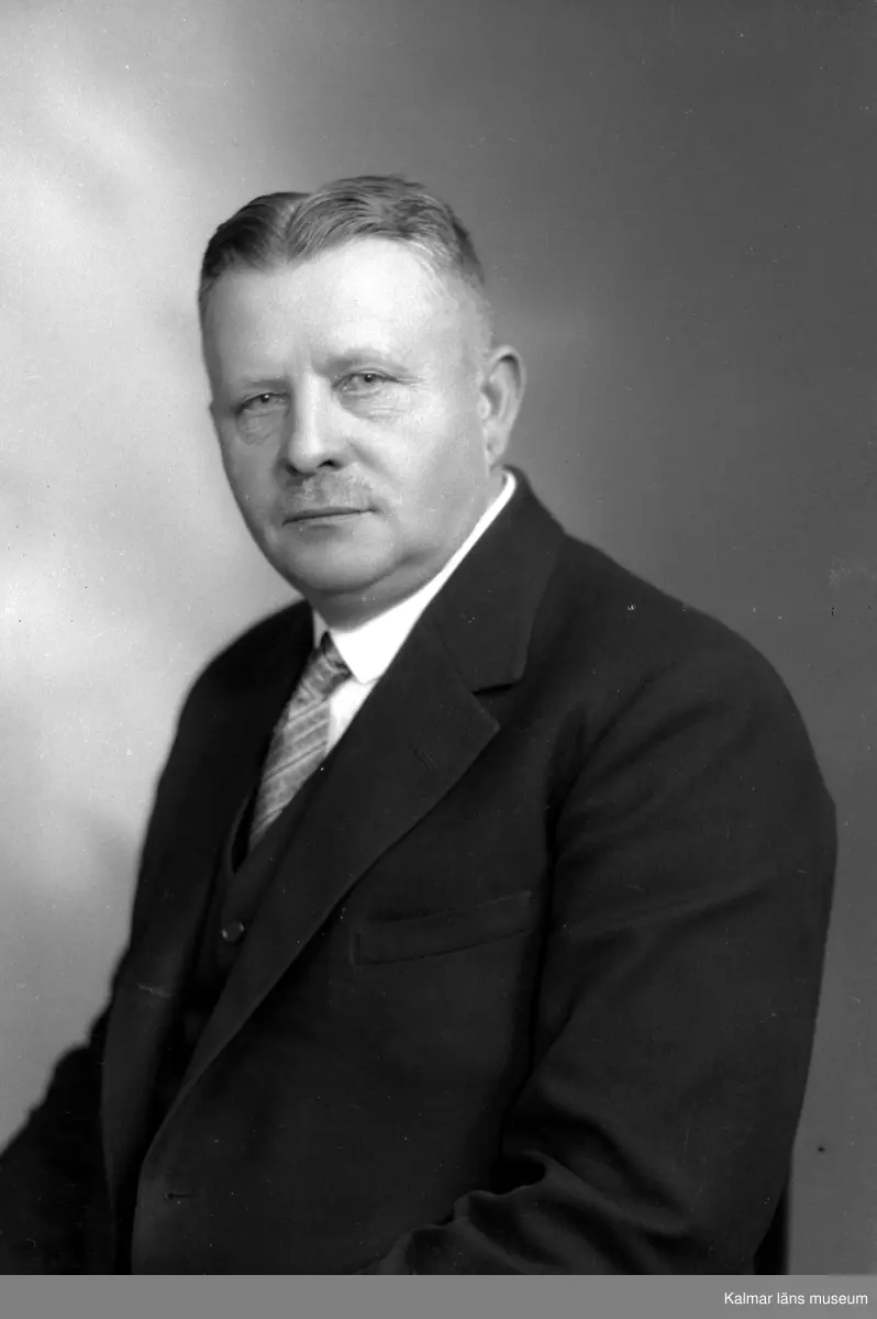 Ateljébild på en man i kostym. Enligt Walter Olsons journal är bilden beställd av byggmästare Herman Olsson.