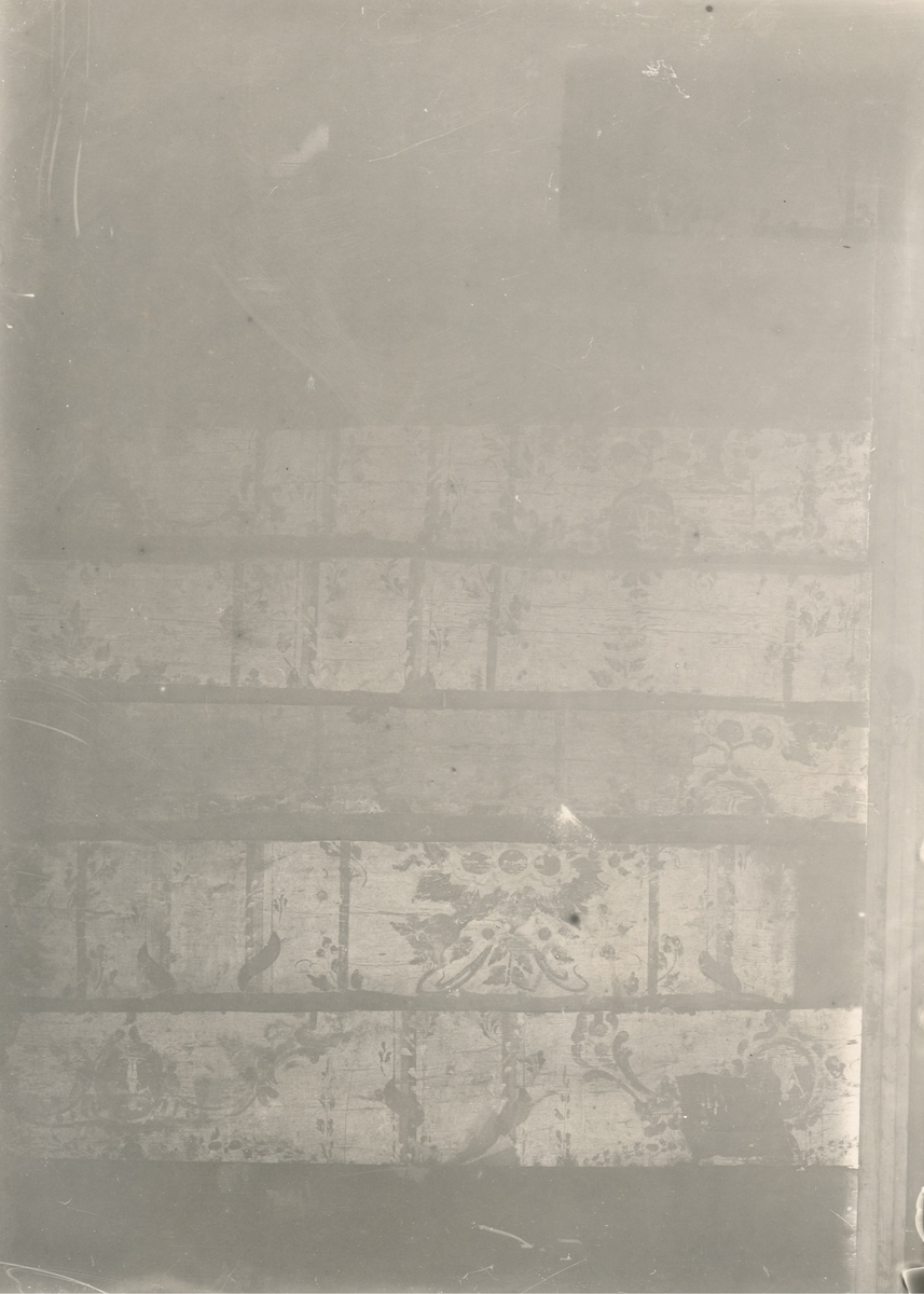 Bruatorp. Vid vägen till Kroka revs ett gammalt hus, som hade [vägg-]målningar. Av virket uppfördes 1925 ett hus strax öster om Bruatorp; fotot visar en vägg med målade stockar.