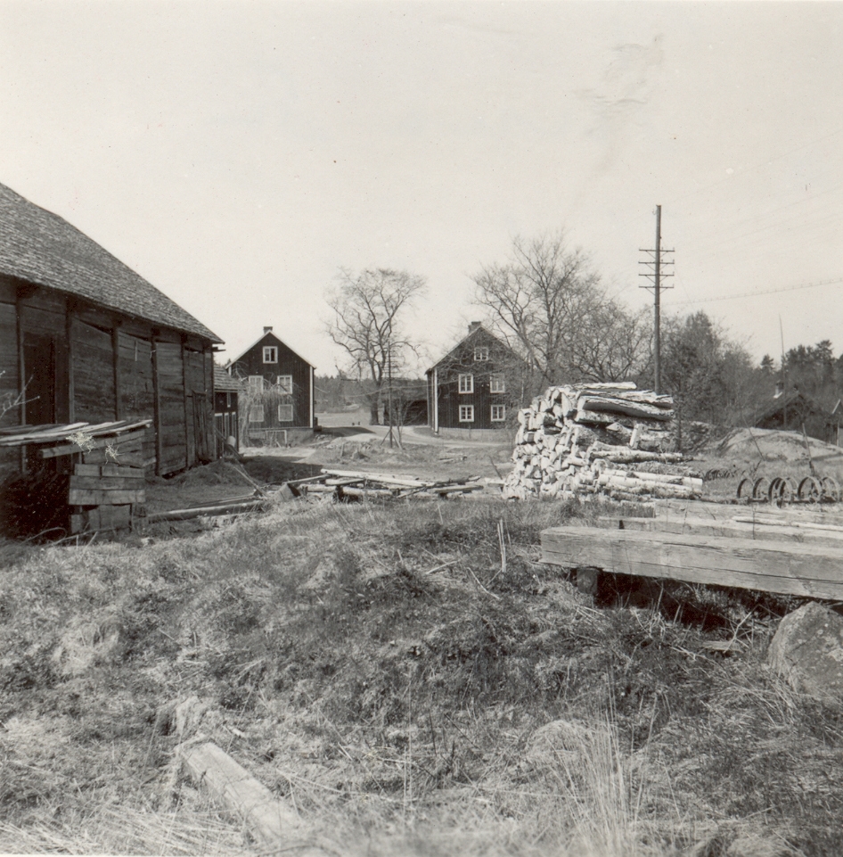 En gårdsmiljö i Ishult. Lada med spåntak till vänster, bostadshus i bakgrunden och en metervedsstapel till höger.