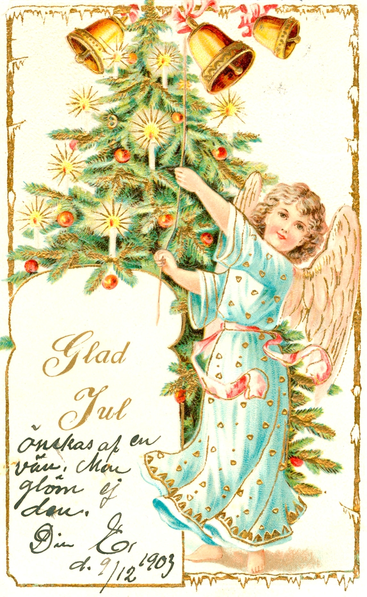 Julkort skickat till Kristina Andersson, född 1865, i Böda, syster till N J Andersson, när hon bodde i USA. Det är skrivet av Edvard Nilsson i Böda, På kortet står tryckt: "Glad Jul". "Önskas af en vän, men glöm ej den. Din E, d 9/12 1903."