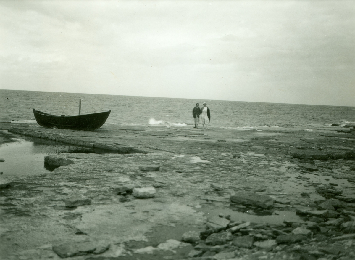 Båt fastgjord vid i flisan nersatt stång för att icke tagas av sjön. Denna strandflisa som översköljes av vågorna kallas "hällpallen"