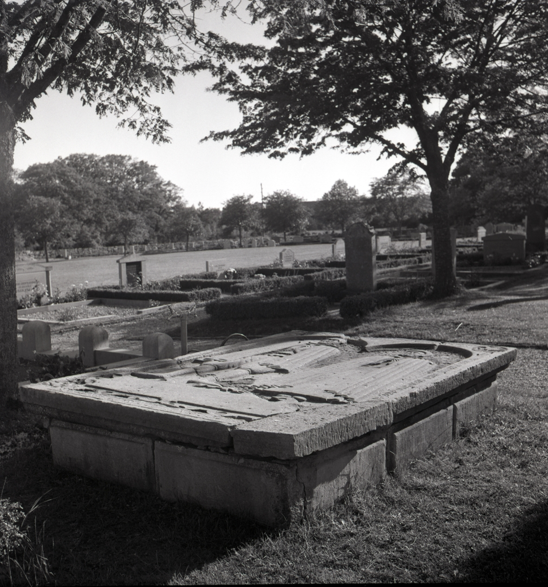 Titel: Den äldsta bevarade gravvården på kyrkogården från 1616 över stenhuggaren Marten Vahti och hans maka.