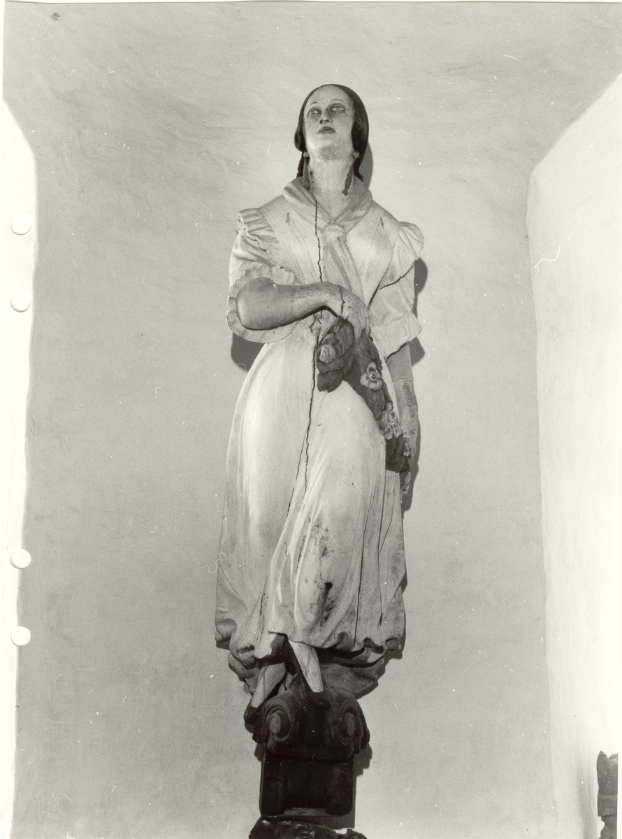 Galjonsbild från barken Mathilda av Kalmar. Bilden tillhörig konstnären Oscar Hullgren, Christiansö, Danmark, där den är uppsatt på ägarens sommarbostad. Nertagen 1939. "Mathilda" var byggd i Workington 1849. England och hette ursprungligen "Curanto". Inköpt till Kalmar på 80-talet. Fördes av kapten A Wernlund. Förlist vid Bölshavn på Bornholm