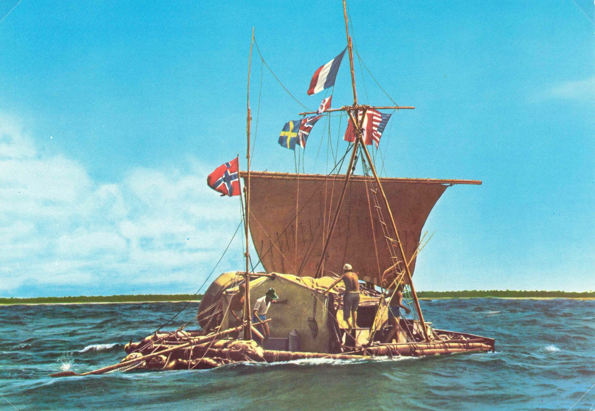 Flotten Kon-tikii Polynesien. Kon-Ti´ki-expeditionen. Thor Heyerdahls expedition 1947. Avfärden ägde rum 28 april 1947 från Limas hamnstad Callao. Nådde fram till den lilla atollen Raroia i Tuamotugruppen 7 augusti samma år.