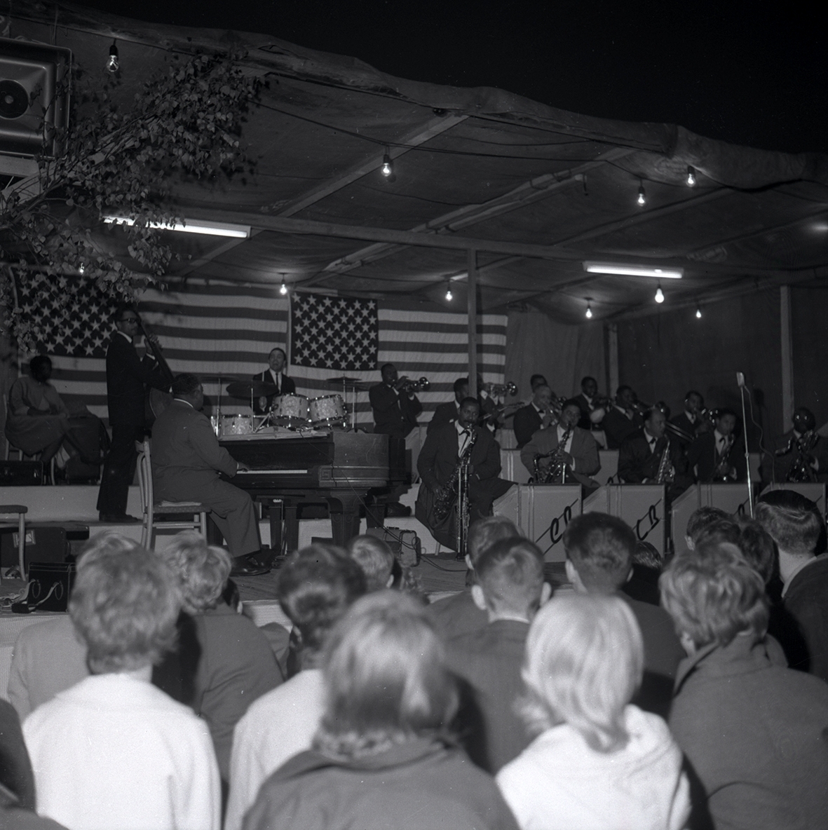 Personer ur Count Basies orkester samt publik.