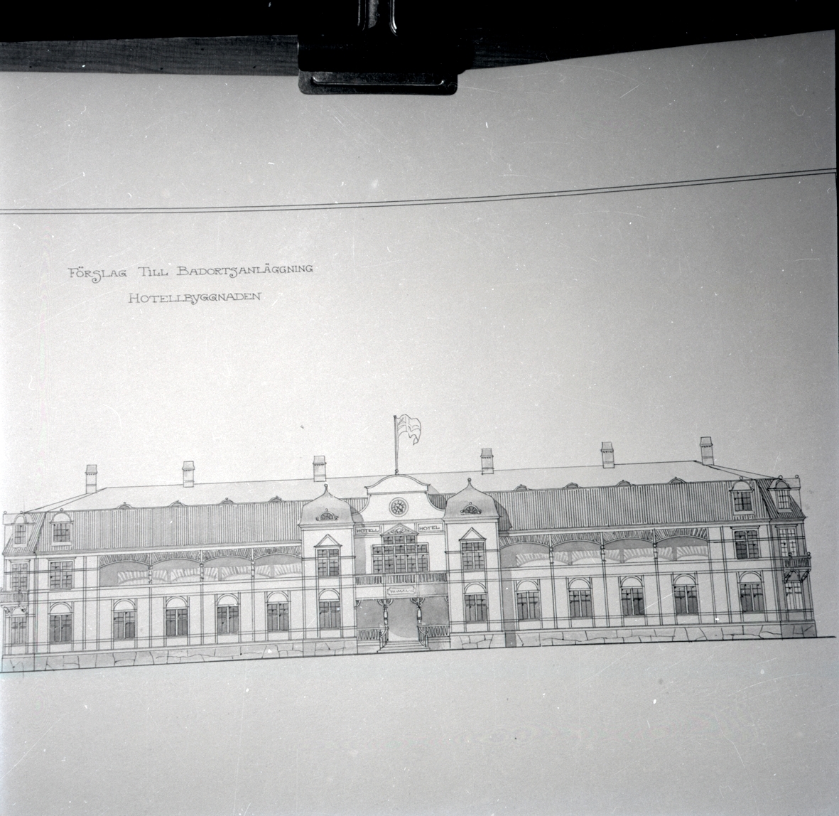 Förslag till badortsanläggning på Öland. Skiss av tänkt hotellbyggnad.