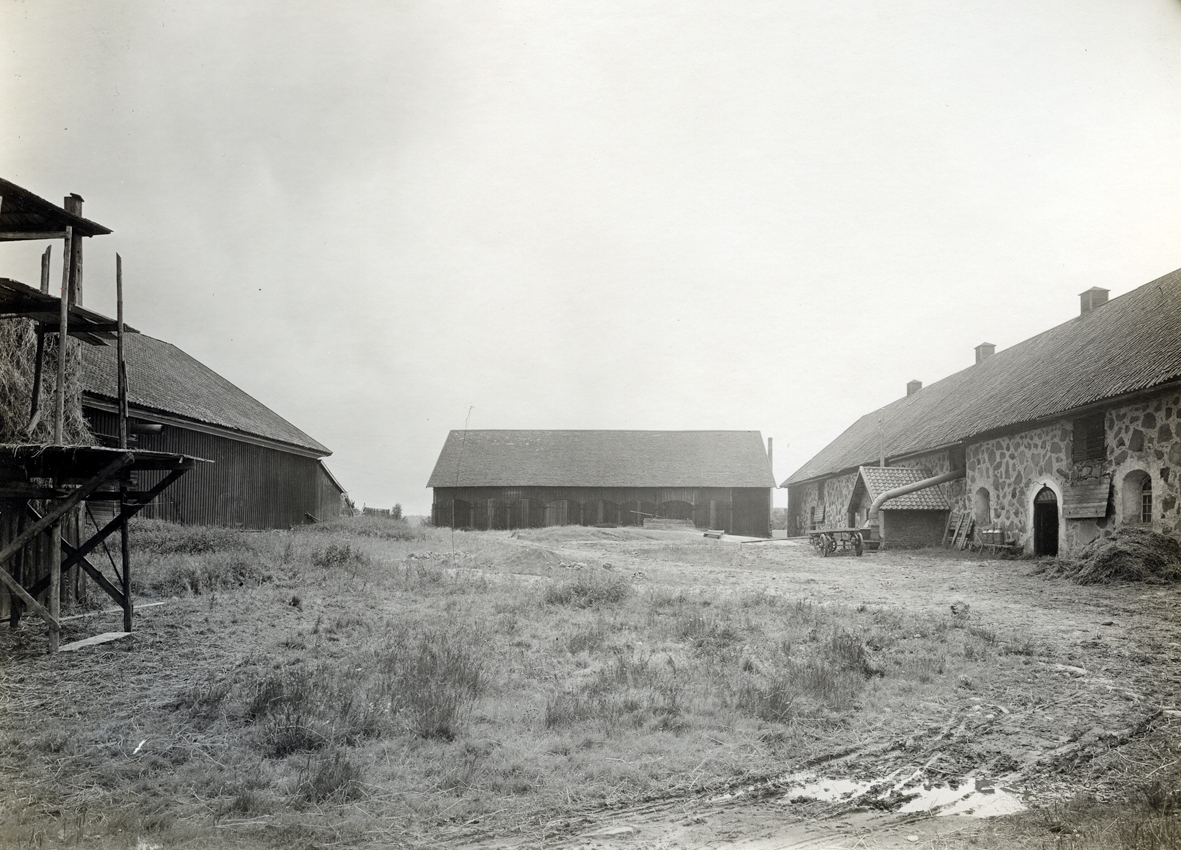 Berga, ladugården. Rakt fram stall. Till höger fähus, till vänster loge. På logens stenfot inhugget: H AF H. På grindstolpar i ladugården: H.H.1864.