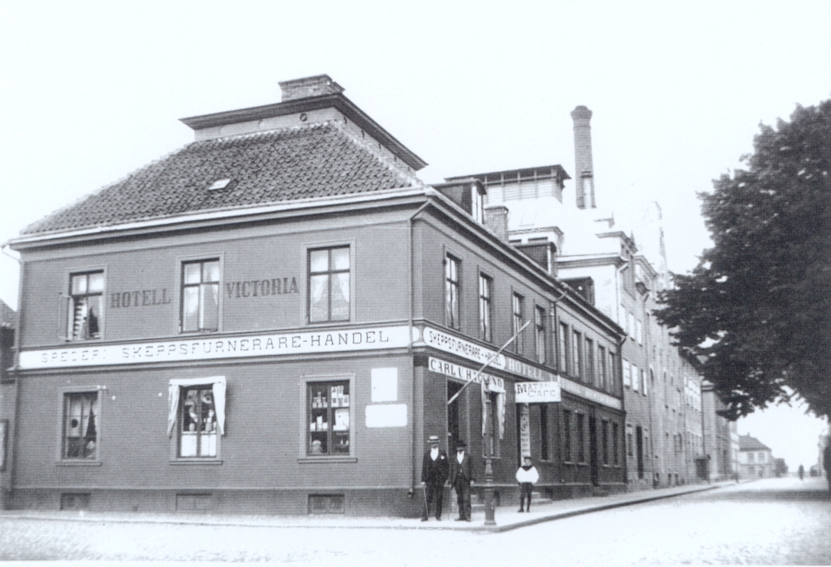 Huset med säteritak vid Lilla Torget. Hotell Victoria. Speceri; Skeppsfunerarehandel.