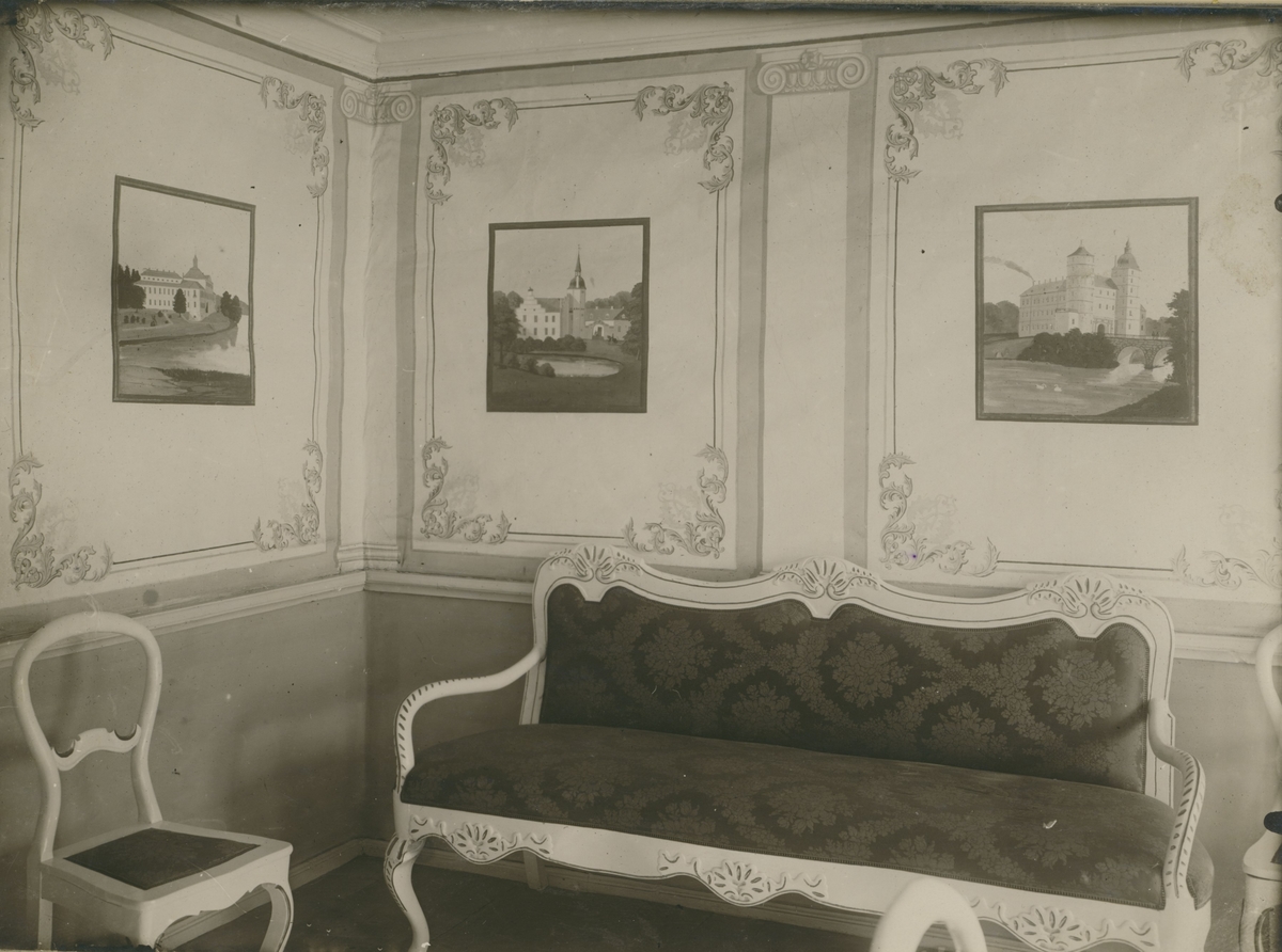 Rum i undre våningen med målningar av Nils Johan Jonsson, utförda efter förebilder i något illustrerat verk.