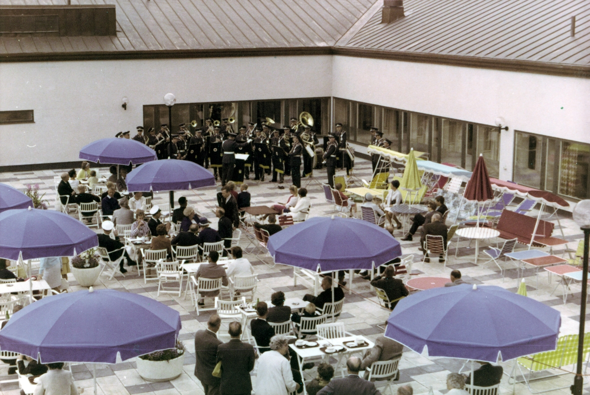 En musikkår underhåller på uteserveringen på Domus takterrass, i Kalmar, 1970.