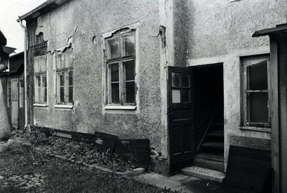 Gårdshus, längst till höger fönster till köket. Dörren leder till övervåningens köksingång.