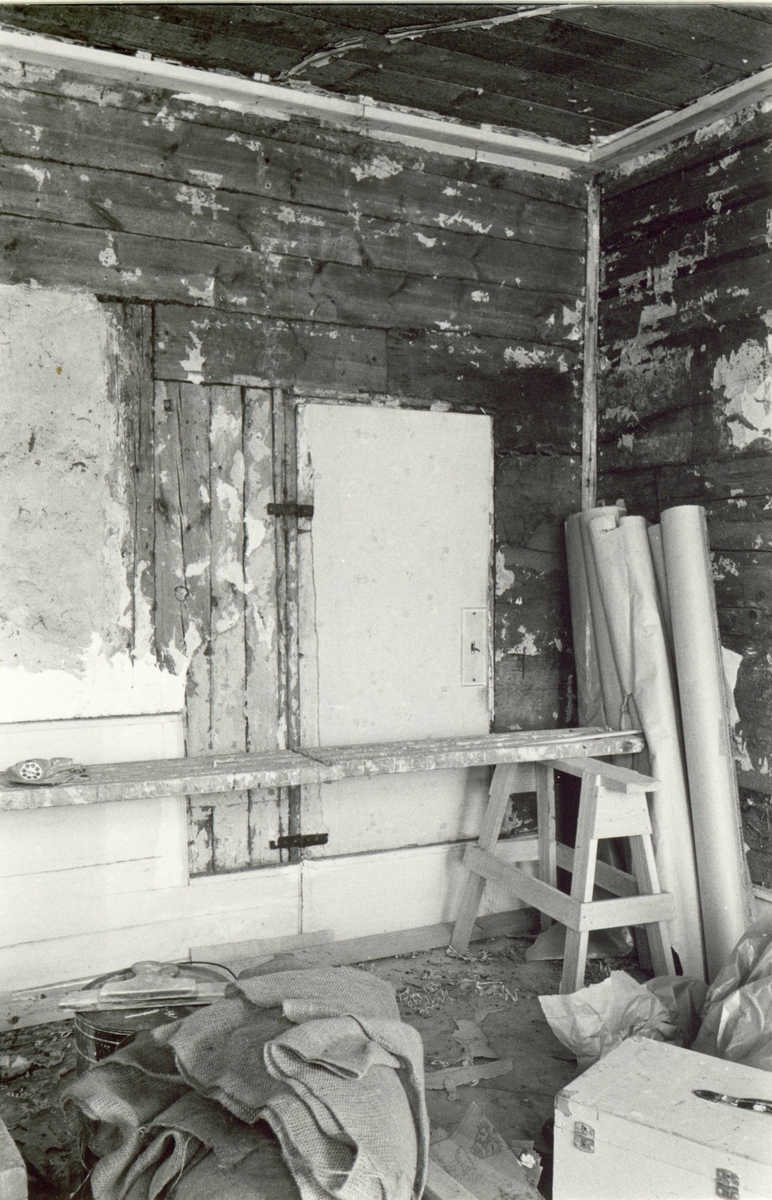 Saleni Krusenstiernska gården. Södra väggen med garderobsdörr. Till vänster kökets spismur.