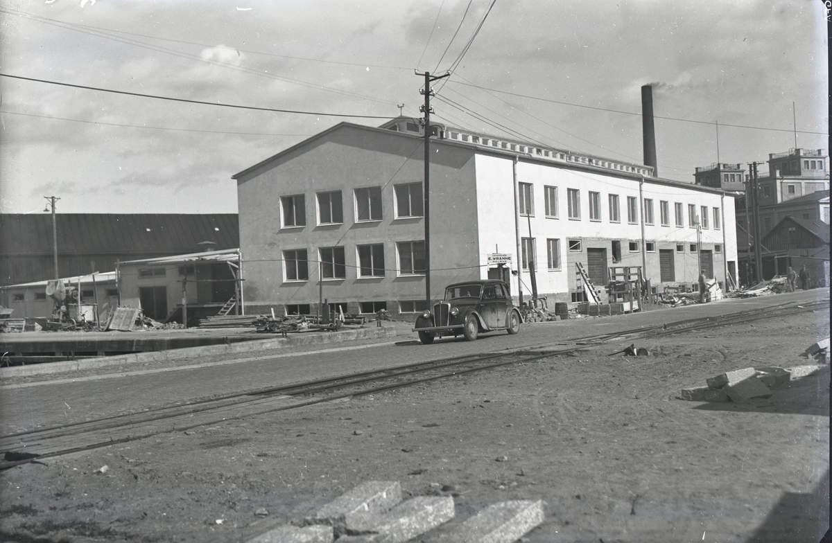 Fabriksbyggnad på industriområdet med spårområde i förgrunden.