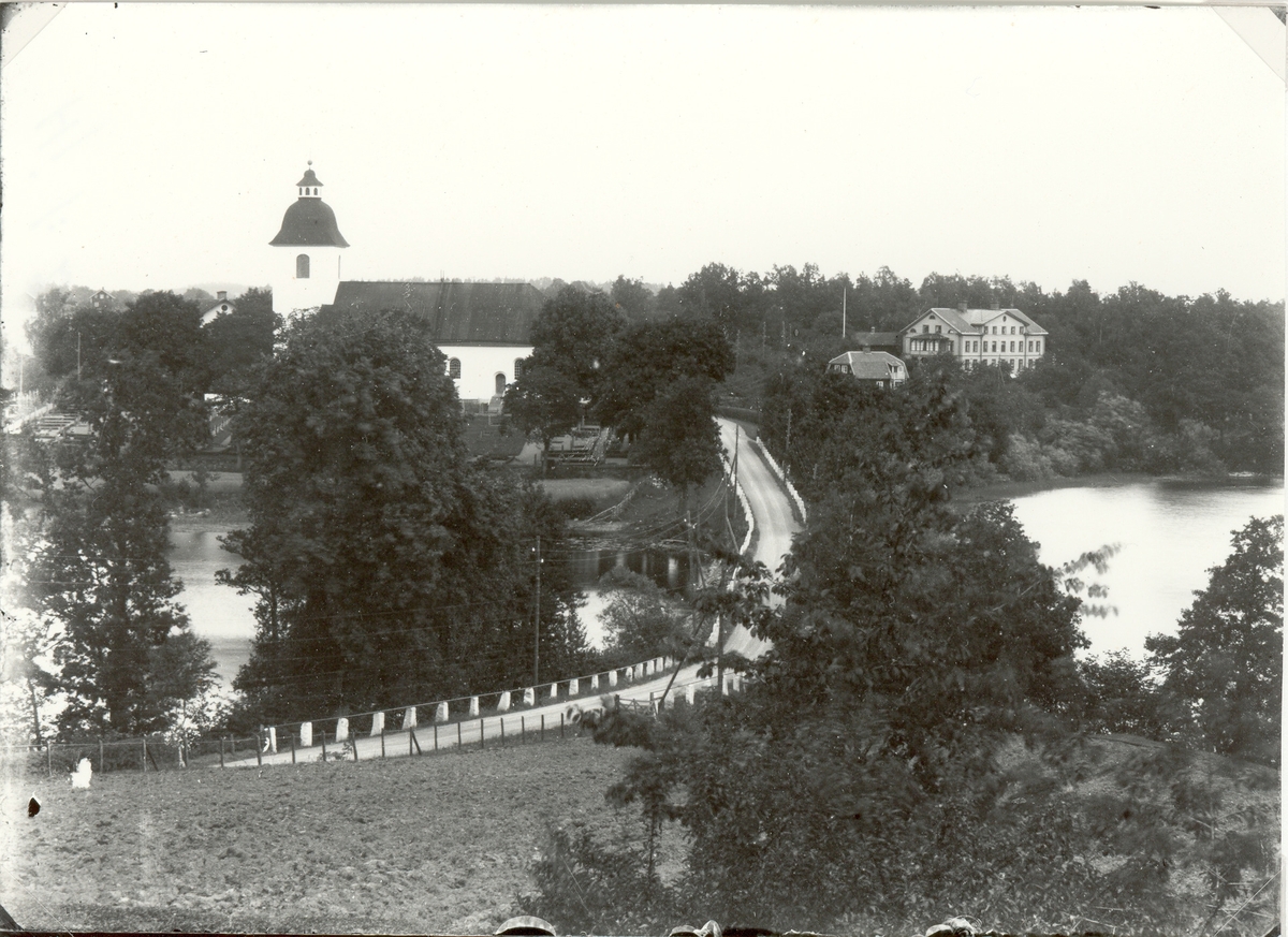Vy från Hjorted med kyrkan, byggnaden till höger är Hjorteds sjukhem och f.d dövstumskola och sjön Hjorten.