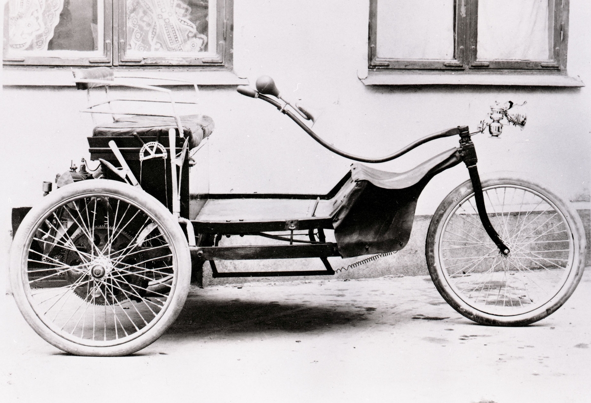 Trehjulig motorvagn, konstruerad och byggd av fabrikör Ernst Aldén i Kalmar omkring 1908. Farten blev ungefär 3 mil i timmen på dålig väg. På baksidan av detta kort står bland annat "denna vagn, som är något begagnad men i godt skick säljer jag till ca 525..." Ernst Aldén.