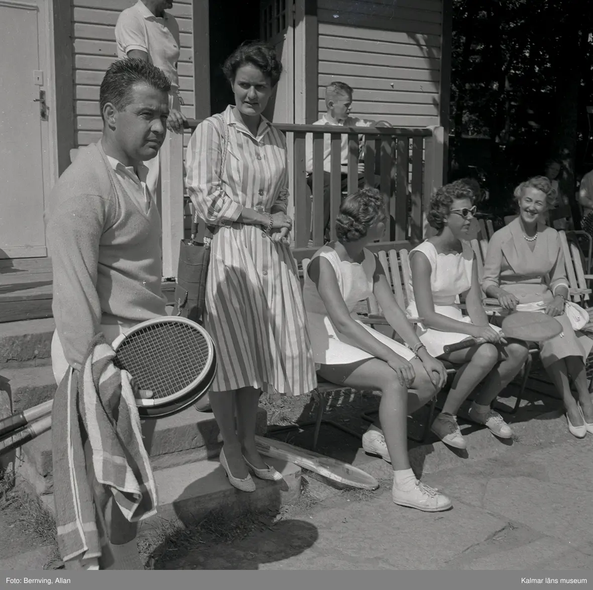 Tennisfinaler och prisutdelning en måndag. Människor vid en byggnad under sommartid. Namn medföljande bild: Mjörne.