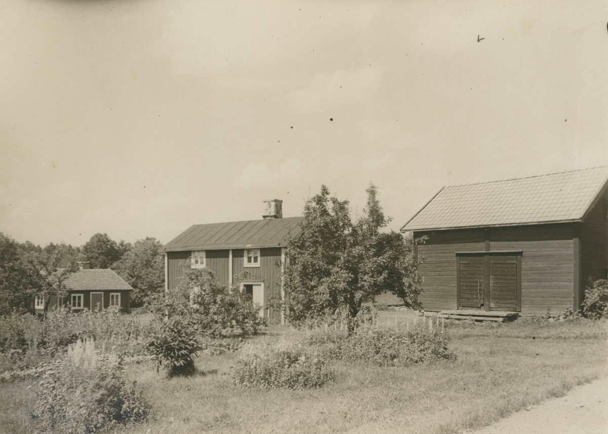 Kyrkoherdebostad. Från vänster bykstugan, arbetarbostad, magasin.