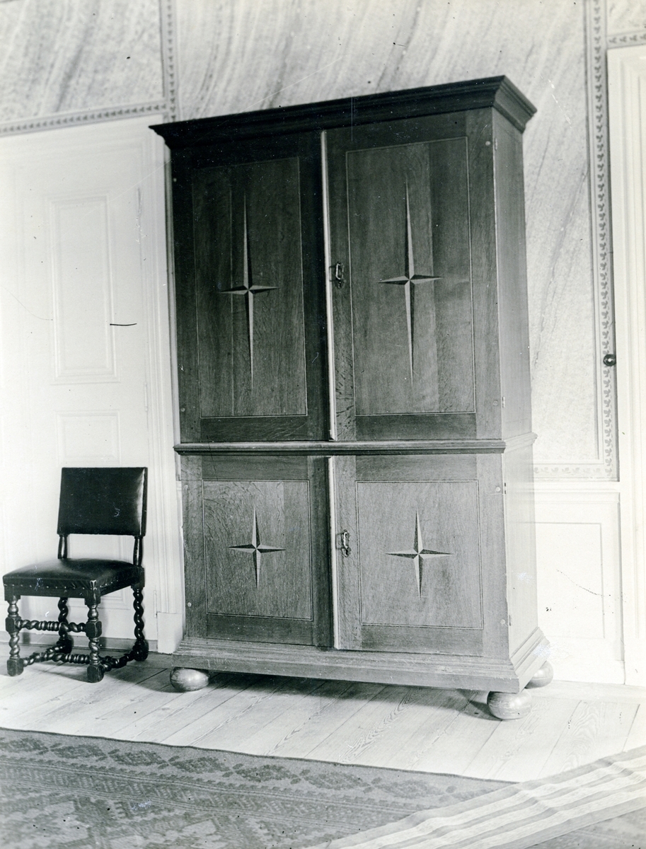 Huvudbyggningen, övre våningen.Matsalen. Ekskåp från Barkestorp.