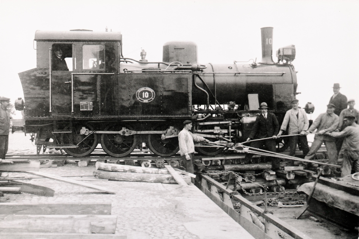 Loktransport till Öland. Personer från vänster: Emil Pettersson förman Erik Johnsson, arbetschef Gustaf Grahn, Axel Axelsson, Edvin Johansson, Axel Karsson och Arthur Gustafsson.