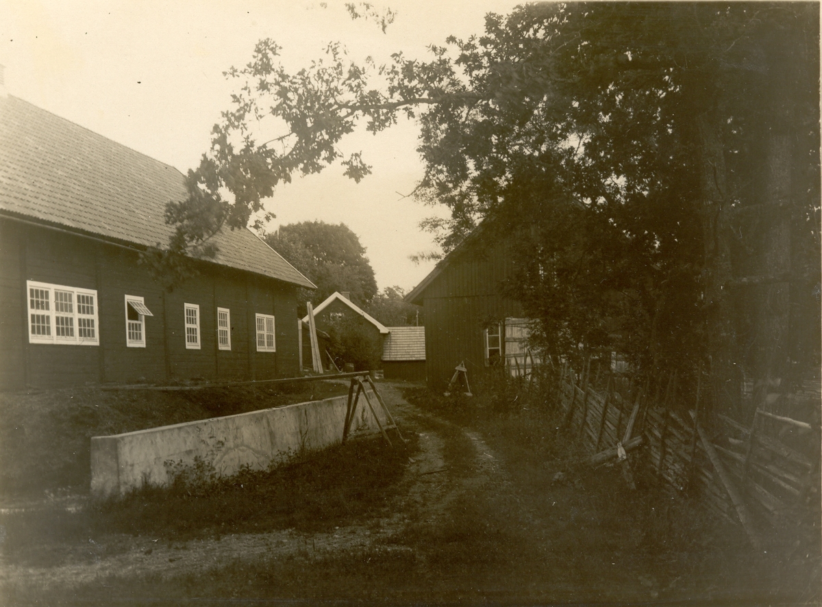 "Ladugården t.v. fähus och stallänga t.h. vagnhus. I fonden mangården."