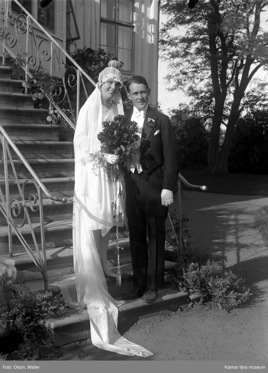 Bröllopsfoto av ett par som står på en trappa. Kvinnan har brudklänning och håller i en blombukett. Mannen har frack. Enligt Walter Olsons journal är bilden beställd av herr Håkansson ifrån Svaneberg i Kalmar.