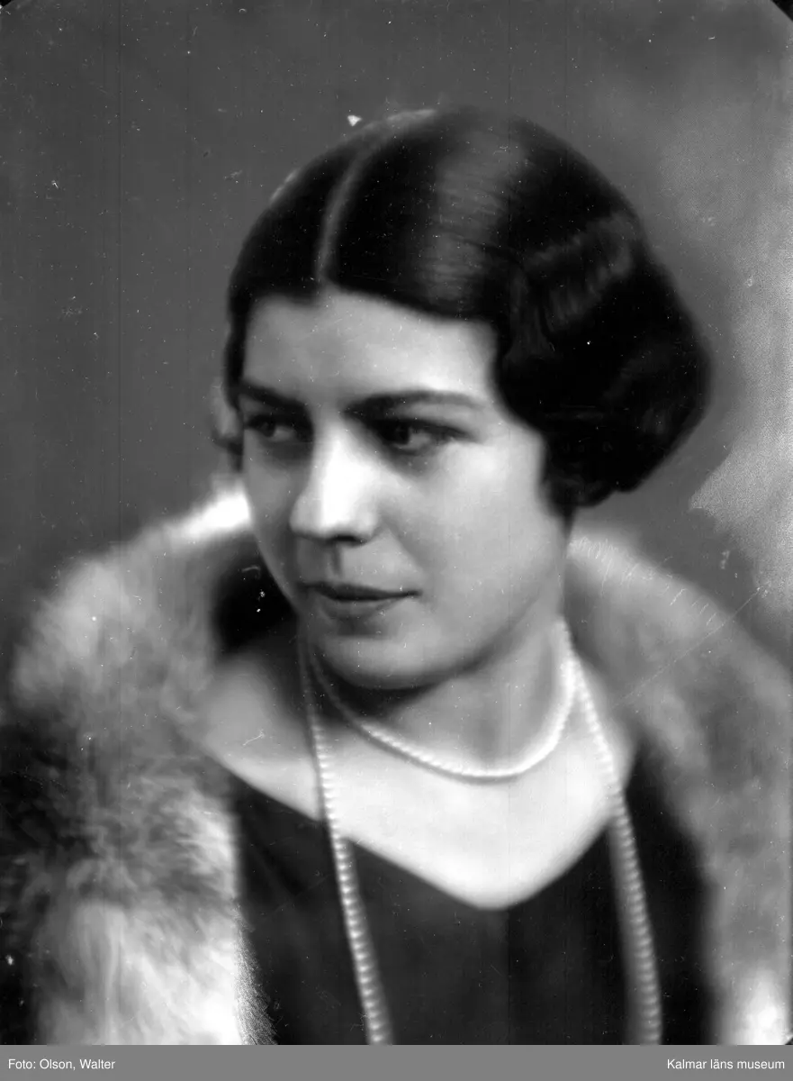 Ateljébild på en kvinna med päls. Enligt Walter Olsons journal är bilden beställd av Eva Isaksson ifrån Fabriksgatan 9 i Kalmar.