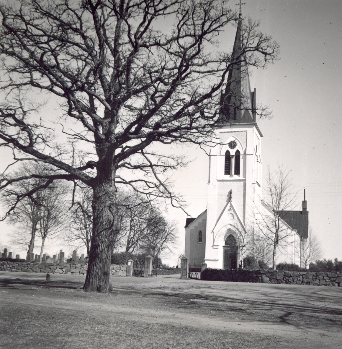Fagerhults kyrka från väster med kyrktornet i nygotisk stil i fonden.