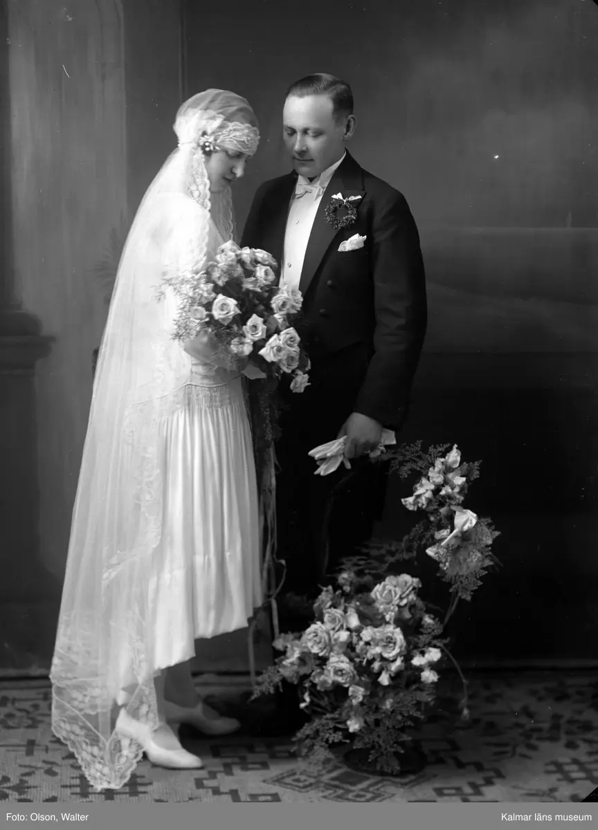 Bröllopsfoto av ett par. Kvinnan och mannen håller i blombuketter. Kvinnan har slöja och mannen har frack. Enligt Walter Olsons journal är bilden beställd av Ragnar Olsson ifrån Ölandsgatan 14. Kalmar läns museum känner inte till om det är den personen som är avporträtterad.
