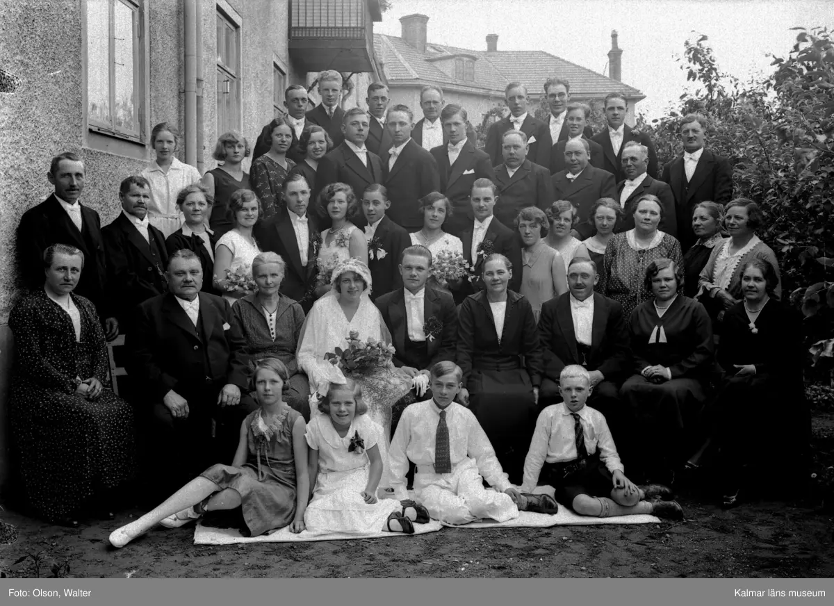 Bröllopsbild på bröllopsgäster och brudpar. Enligt Walter Olsons journal är bilden beställd av C E Skoglund ifrån Kvarnseden.