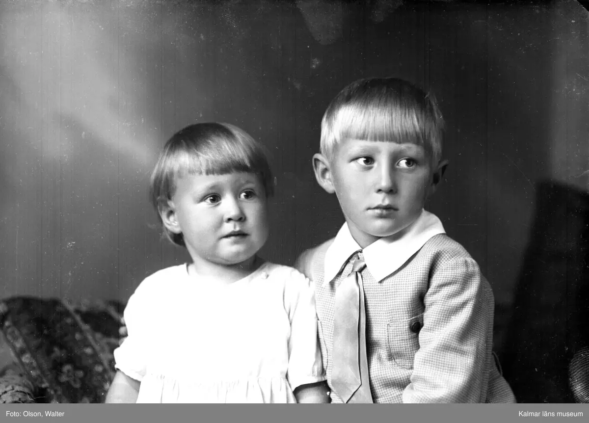 Ateljébild på två pojkar. Enligt Walter Olsons journal är bilden beställd av herr A Mejáre ifrån Baggensgatan 20 i Kalmar.