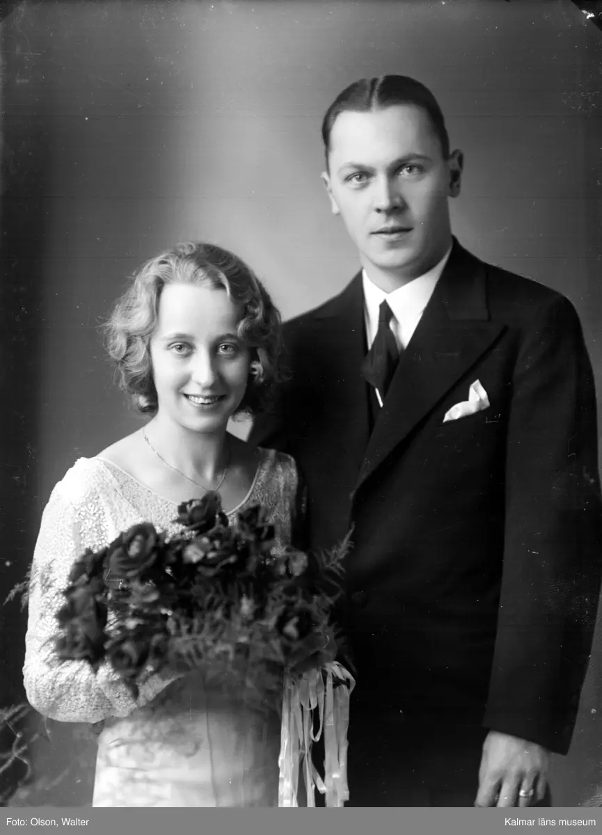 Bröllopsbild. Kvinnan håller i en blombukett. Enligt Walter Olsons journal är bilden beställd av herr Gösta Rosenlund ifrån vikingavägen 3 i Kalmar.
