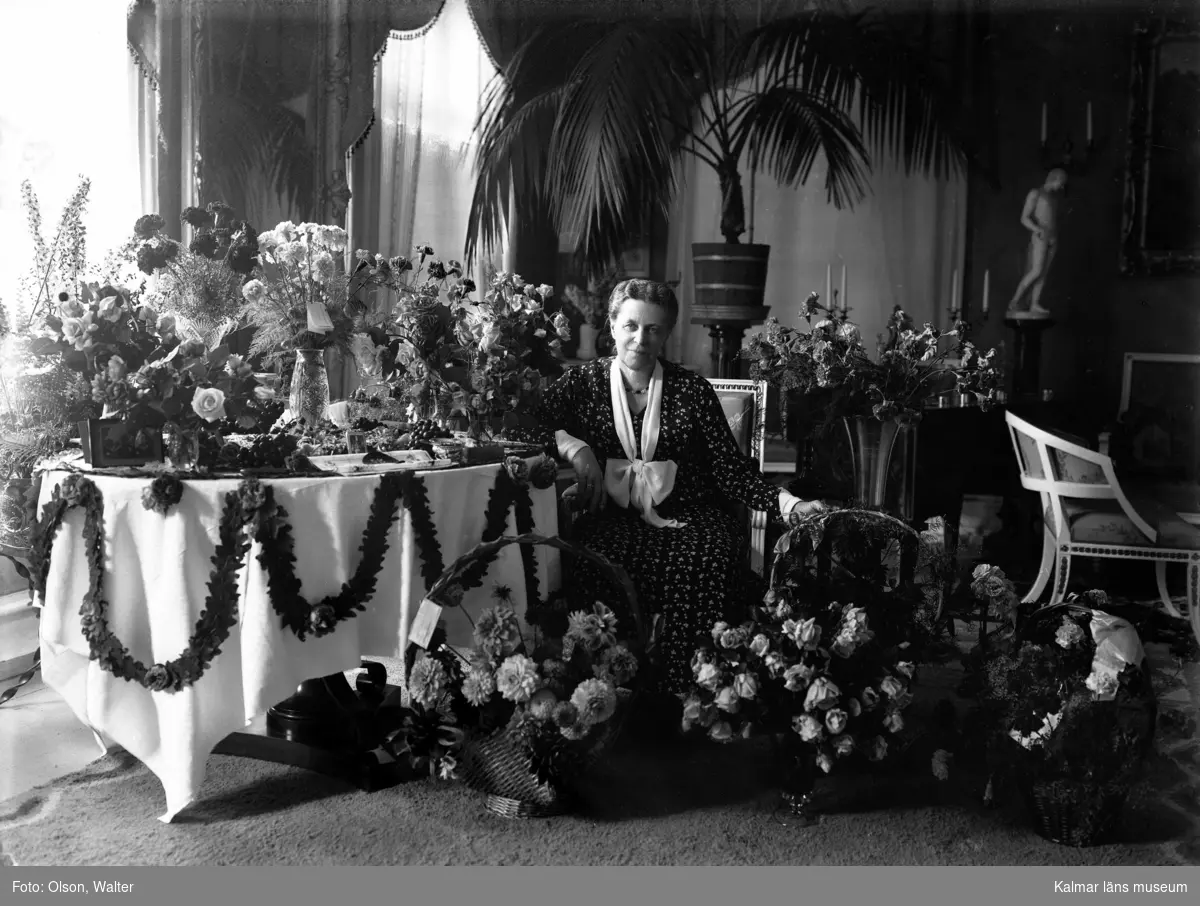 En friherrinna som sitter vid ett blomsterarrangemang vid en födelsedag. Enligt Walter Olsons journal är bilden beställd av friherrinnan A Rappe ifrån Christinelund utanför Vassmolösa.