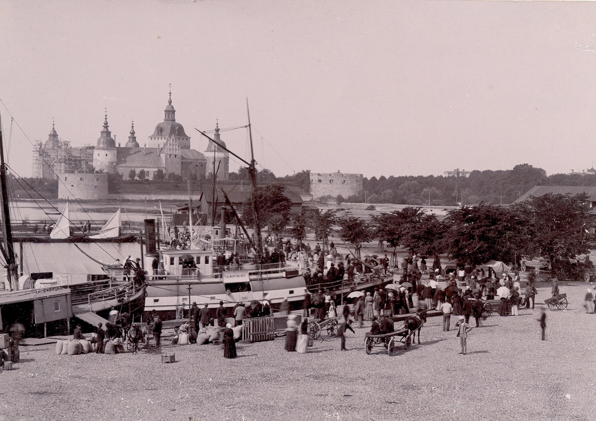 Livlig verksamhet i Gamla Ölandshamnen när gods och passagerare lastas på och lossas av Kalmarsund 5. Fartyget som var en av de första