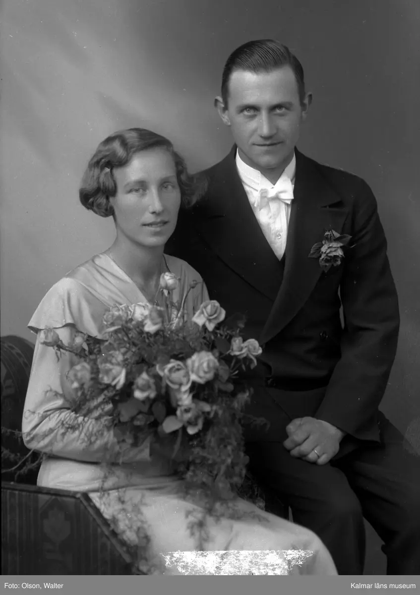 Ateljébild. Kvinnan har klänning och håller i en blombukett. Mannen har kostym. Enligt Walter Olsons journal är bilden beställd av Evert Öhlander ifrån Läroverket.