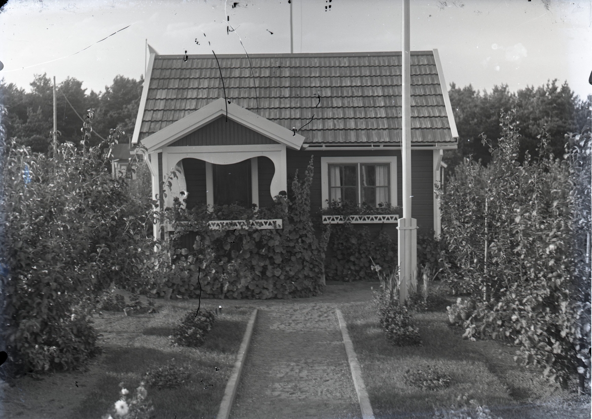 En stuga vid Kalmar södra koloniområde, fotograferad omkring 1930. Kalmar södra koloniförening grundades 1917 och har idag 105 kolonilotter. Området ligger strax söder om länssjukhuset i Kalmar med huvudingång från Stensbergsvägen.