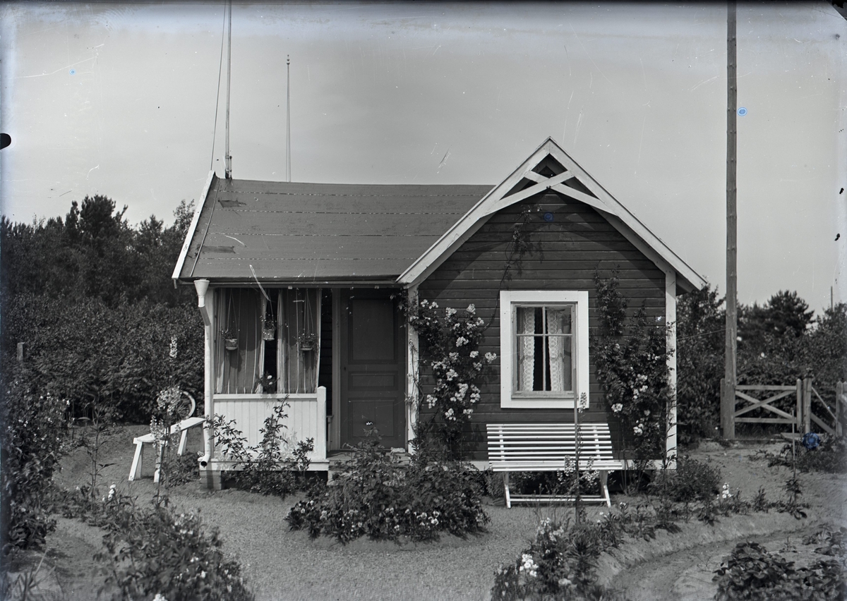 Titel: En stuga vid Kalmar södra koloniområde, fotograferad omkring 1930. Kalmar södra koloniförening grundades 1917 och har idag 105 kolonilotter. Området ligger strax söder om länssjukhuset i Kalmar med huvudingång från Stensbergsvägen.