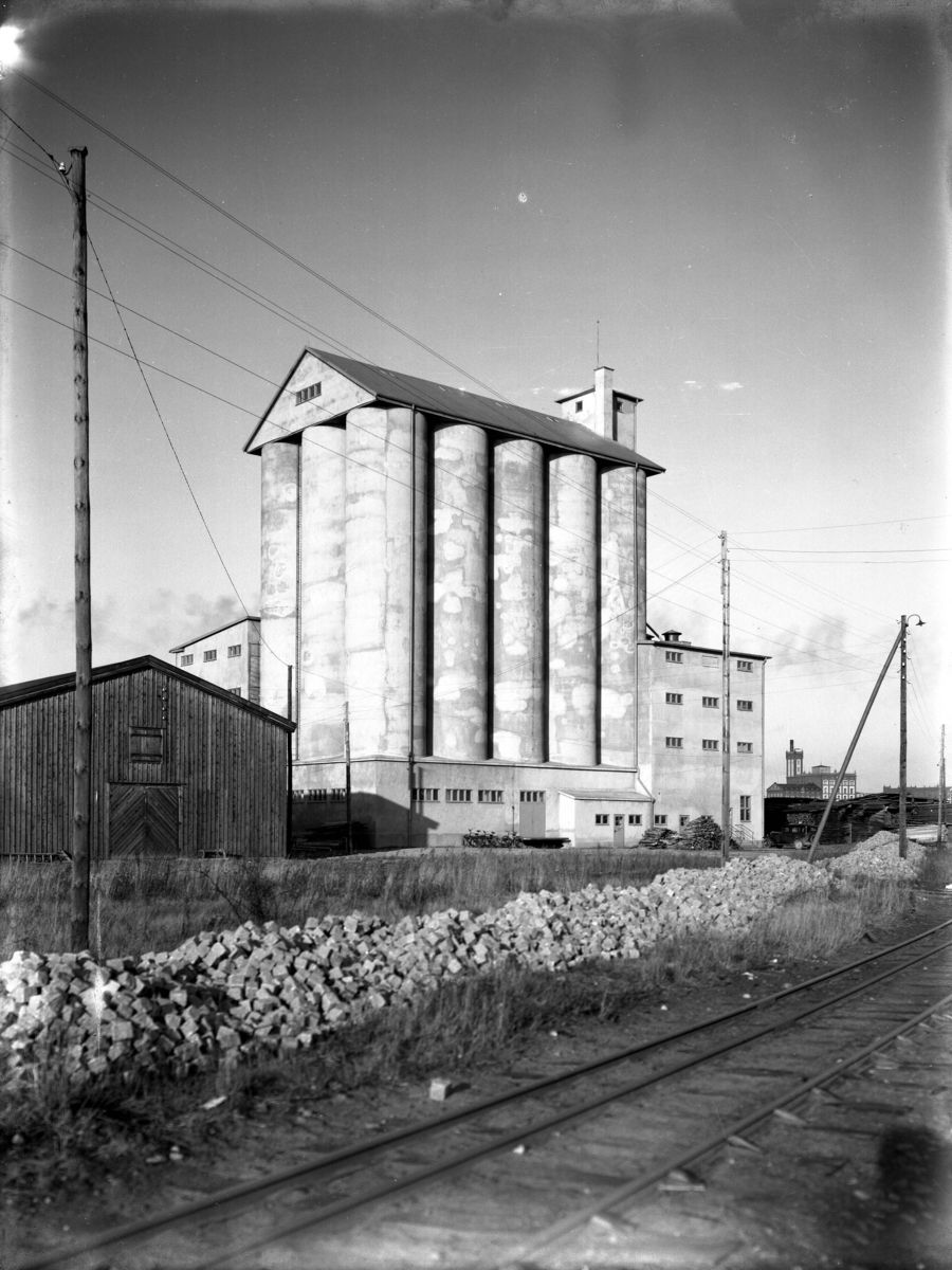 Bild på silosar och ett järnvägsspår. Enligt Walter Olsons journal är bilden beställd av Svenska maskinverken i Södertälje.