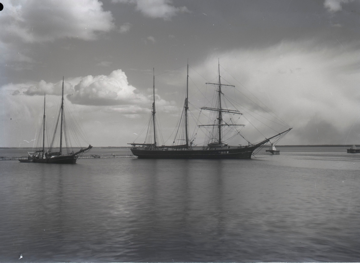 Två segelfartyg ligger för ankar vid vågbrytaren strax intill hamninloppet.