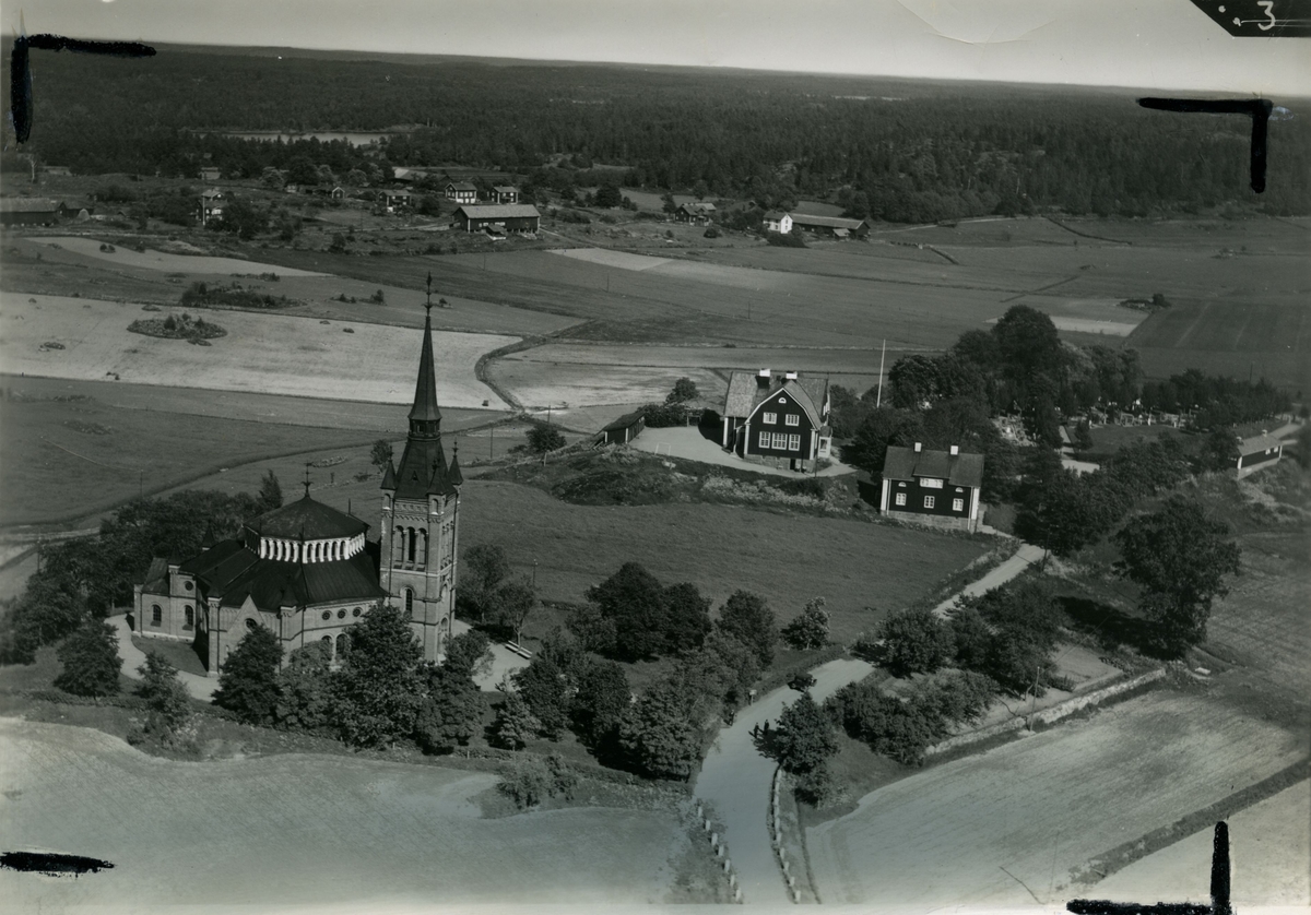 Flygfoto över Gladhammar. Samhället med kyrkan i centrum.